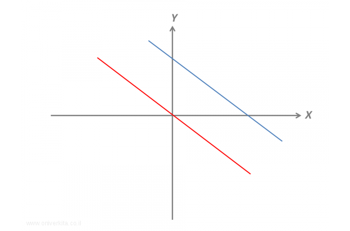 אם משוואת הישר הכחול היא: \[\begin{aligned} y=-3x+7 \end{aligned}\] מה עשויה להיות משוואת הישר האדום?
